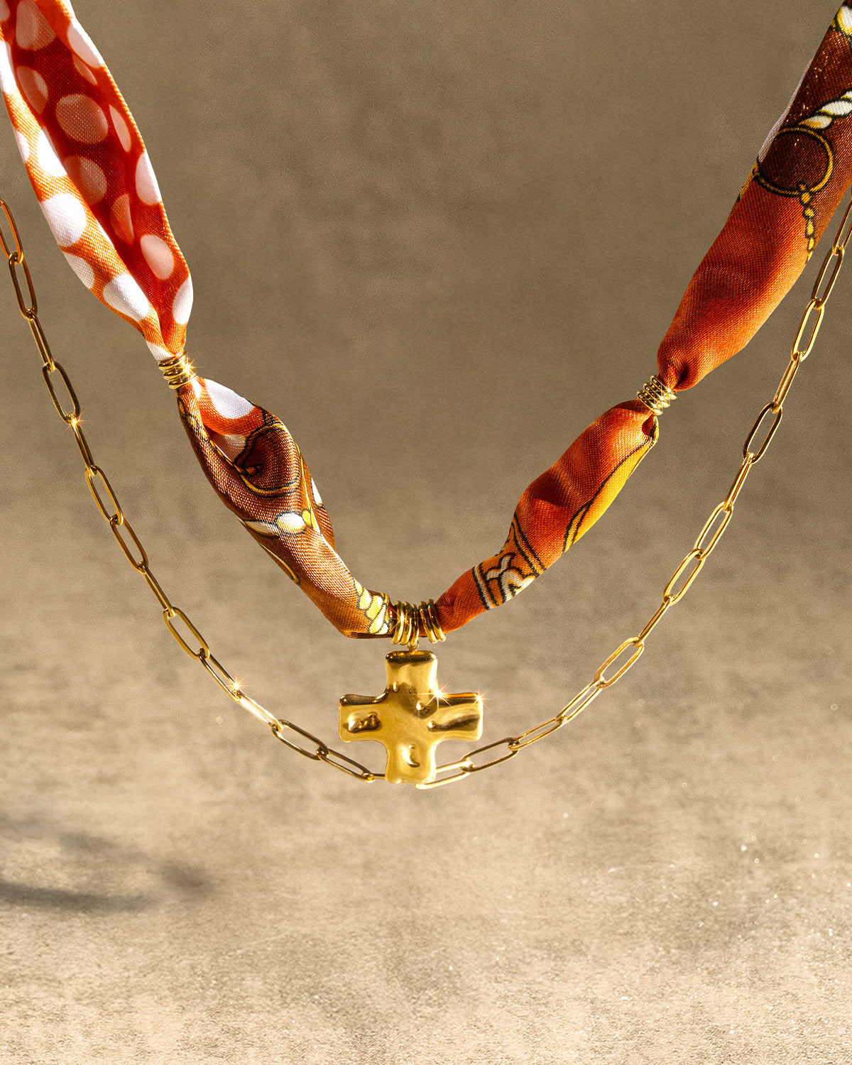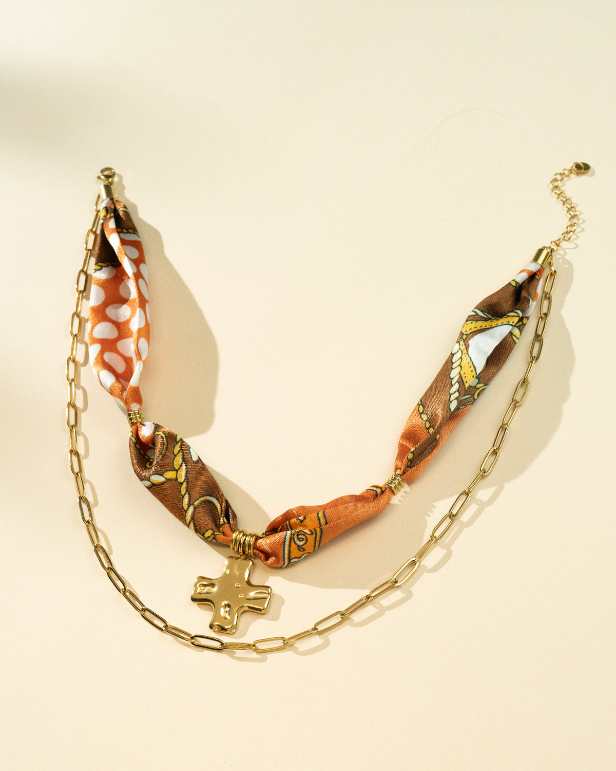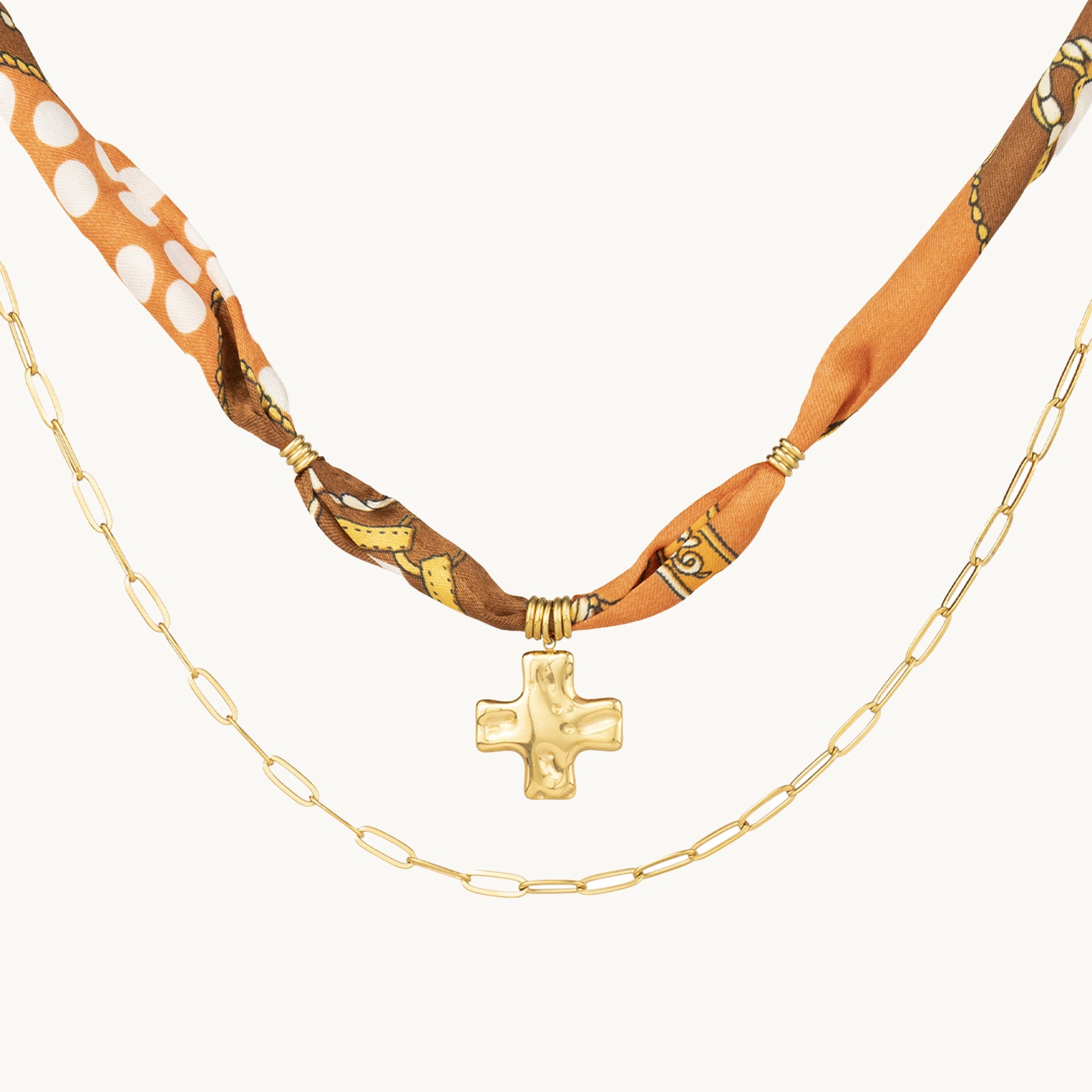 DoDoBeads Brown Scarf Necklace with Gold Cross Pendant