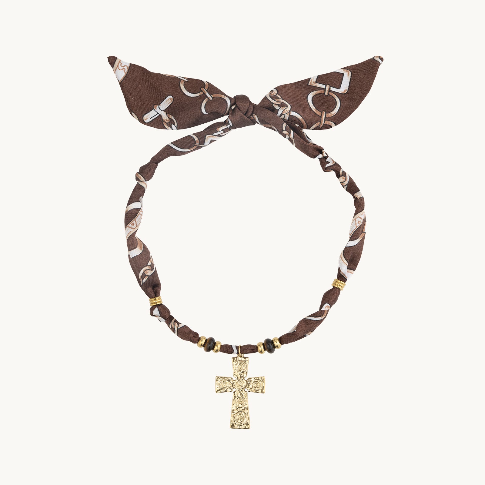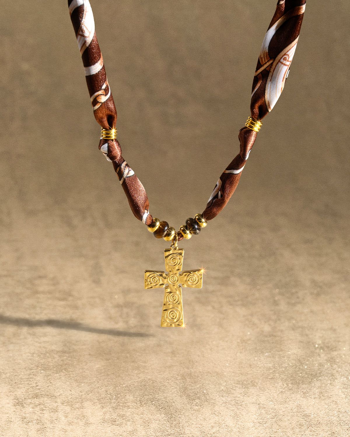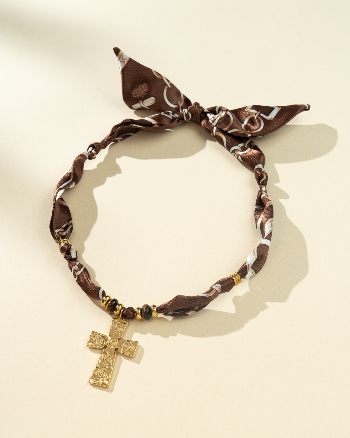 DoDoBeads Brown Scarf Necklace with Gold Engraved Cross Pendant